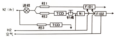 樣品氣通過一路載氣進入FID1檢測器檢測出烴類氣體,通過另一路載氣先進入TCD檢測器檢測H2、O2;然后經鎳轉化爐,進入FID2檢測器檢測出CO、CO2,克服大量CO、CO2對烴類氣體,尤其是對C2H2的檢測干擾,大大提高了烴類氣體的檢測靈敏度;